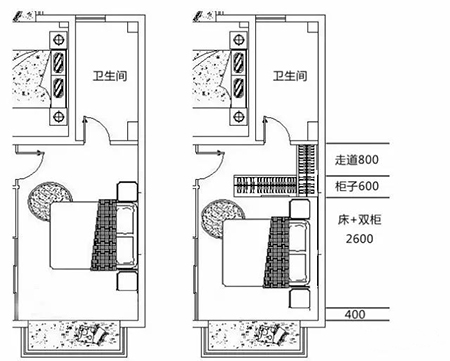 增加了一排柜子,相當(dāng)于一個(gè)小的衣帽間,避免了洗手間的門(mén)對(duì)著床,缺點(diǎn)是會(huì)稍微有點(diǎn)壓抑的感覺(jué),建議4.5m以上的房間用這種方案。很多設(shè)計(jì)圖的床都是偏小的,容易造成視角混淆,所以我這里標(biāo)注了一下尺寸方便大家理解。