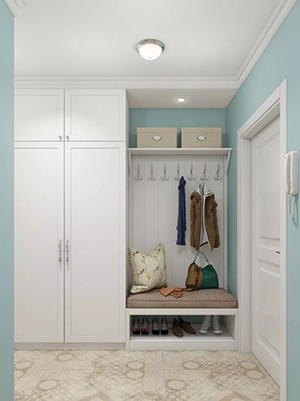 建議:鞋柜可以做成懸空的方式,最下面的位置剛好可以收納常穿的鞋子,也可以搭配穿鞋凳,給拖鞋和需要外出穿的鞋一個固定的位置。
