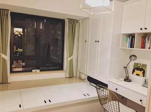 飄窗原本是國外的設(shè)計(jì)元素,后來逐漸流行于國內(nèi)建筑設(shè)計(jì)中。飄窗安裝榻榻米,將原本作用甚微的飄窗改造成集收納、觀景等功能于一身多功能區(qū)域。