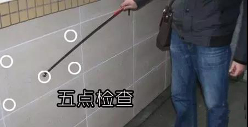 從圖中大家可以看出,空鼓現象多出現在瓷磚的四個角和中間的位置,檢查也很簡單,就是用小錘在這五個點輕輕敲擊,根據聲音判別。