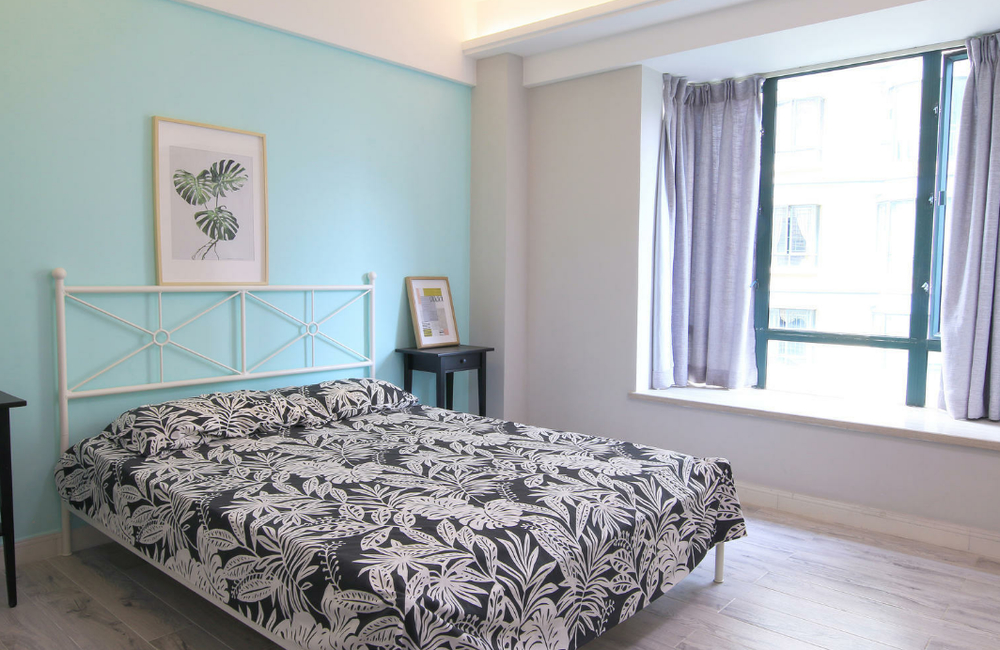 臥室的裝修風格。簡歐風格的臥室依舊以藍色為背景主題,主要以功能性和實用舒適為考慮的重點,臥室的頂部不設頂燈,多用溫馨柔軟的成套布藝來裝點,同時在軟裝和用色上非常統一。