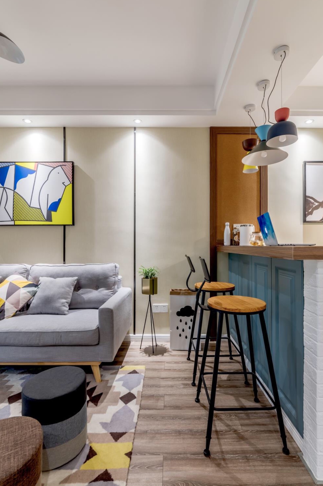 ?餐廳;進門右手邊就是餐廳,干凈的線條,層次豐富的色彩和精心挑選的軟裝,幾個元素相搭配,共同營造出一個溫馨的就餐空間,僅僅是看著溫潤如水的木色餐桌椅和暖暖的燈光,家的溫馨就已經四處蔓延,客餐廳一體讓空間更加通透,巧妙的設計一個吧臺區作為分割,增加功能性的同時又美觀,彩色系的小吊燈也給這里增加了一些小情調。