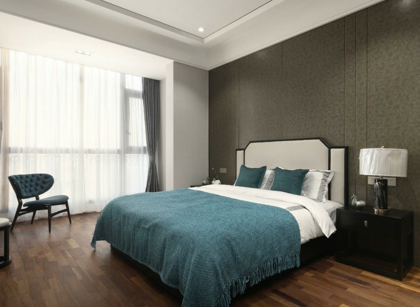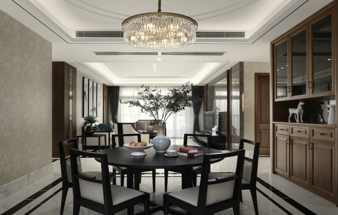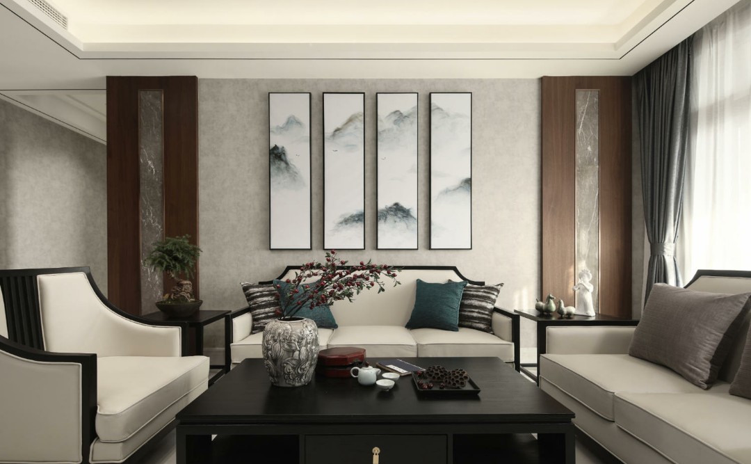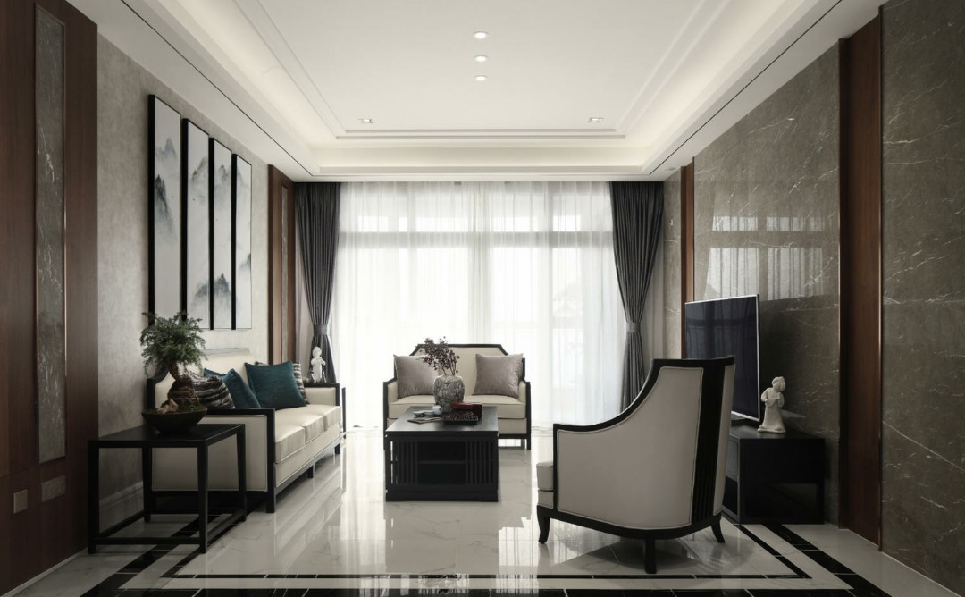 案例簡(jiǎn)介:業(yè)主是老師,喜歡中國(guó)古典文化,希望裝修帶些古香古色的韻味,整體的色調(diào)要要淡雅,不需要過(guò)多復(fù)雜的裝飾。通過(guò)與客戶(hù)的溝通,了解到客戶(hù)是個(gè)非常低調(diào)儒雅的人,喜歡安靜優(yōu)雅的居家環(huán)境,于是在設(shè)計(jì)師的精心設(shè)計(jì)下,這樣一個(gè)如潑墨的山水畫(huà)的中式風(fēng)格呈現(xiàn)在我們眼前。客廳的水墨裝飾畫(huà)猶如點(diǎn)睛之筆,一開(kāi)始就抓住了人的視線(xiàn),上下五千年的文化一脈相承,互通有無(wú)。有時(shí)候讓人舒適的就是秩序統(tǒng)一,選對(duì)了裝飾掛畫(huà),整個(gè)家都變得秀色可餐起來(lái)。電視柜選擇了極簡(jiǎn)的黑色造型,下面還有一層條板的設(shè)計(jì),兼具實(shí)用性和顏值擔(dān)當(dāng)。隨處可見(jiàn)的陶瓷、雕塑、小擺件等,在用他們特有的語(yǔ)言訴說(shuō)著同樣的古典人文氣息。餐廳在硬朗的線(xiàn)條上輔以圓潤(rùn)線(xiàn)條,圓形餐桌作為中和,打破了單調(diào),也為整體增添了一抹柔美。定制大理石高踢腳線(xiàn),裝飾性和功能性俱佳,打掃起來(lái)毫不費(fèi)力。一旁還做了餐邊柜,增加了儲(chǔ)物功能。主臥用孔雀藍(lán)貫穿整個(gè)空間,從床品到椅子彰顯藍(lán)的魅力,搭配白色的床品干凈純粹,達(dá)到簡(jiǎn)約而不簡(jiǎn)單的視覺(jué)效果。兒童房定制的幾何形書(shū)架節(jié)省了空間亦不失特色,淡藍(lán)色的墻紙顯得整個(gè)房間安靜卻不失活潑。