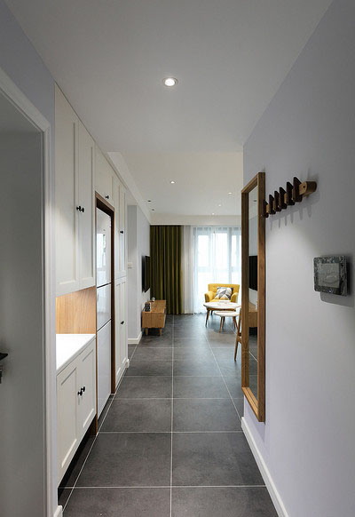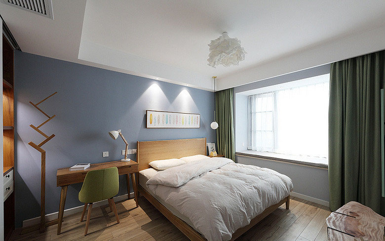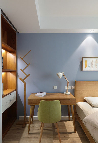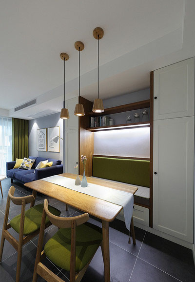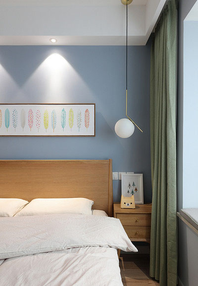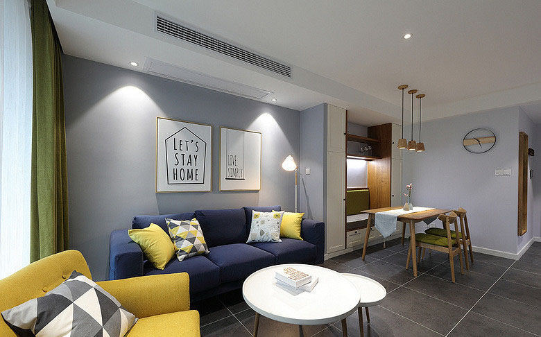 這個案例是屬于婚房設計,業主是一對準備結婚的戀人,戀愛的甜蜜讓人想到了春天,所以設計色彩比較豐富,主色調藍白為主,恬靜,搭配原木家具給他們創造了溫馨的空間,女主人十分時尚,深藍色的沙發和黃色的抱枕,形成強烈的視覺對比,十分時尚,家里的裝飾畫和家具都是簡約系列,也是由于他們的性格比較簡單,餐廳和客廳設計師特意做了開放式設計,沒有改變原來的結構,節省了預算,也保持了空間的開闊。因為樓層較高,采光都不錯,所以家里的地板顏色選擇了深棕色系列,比較耐臟,搭配家里的軟裝也十分和諧