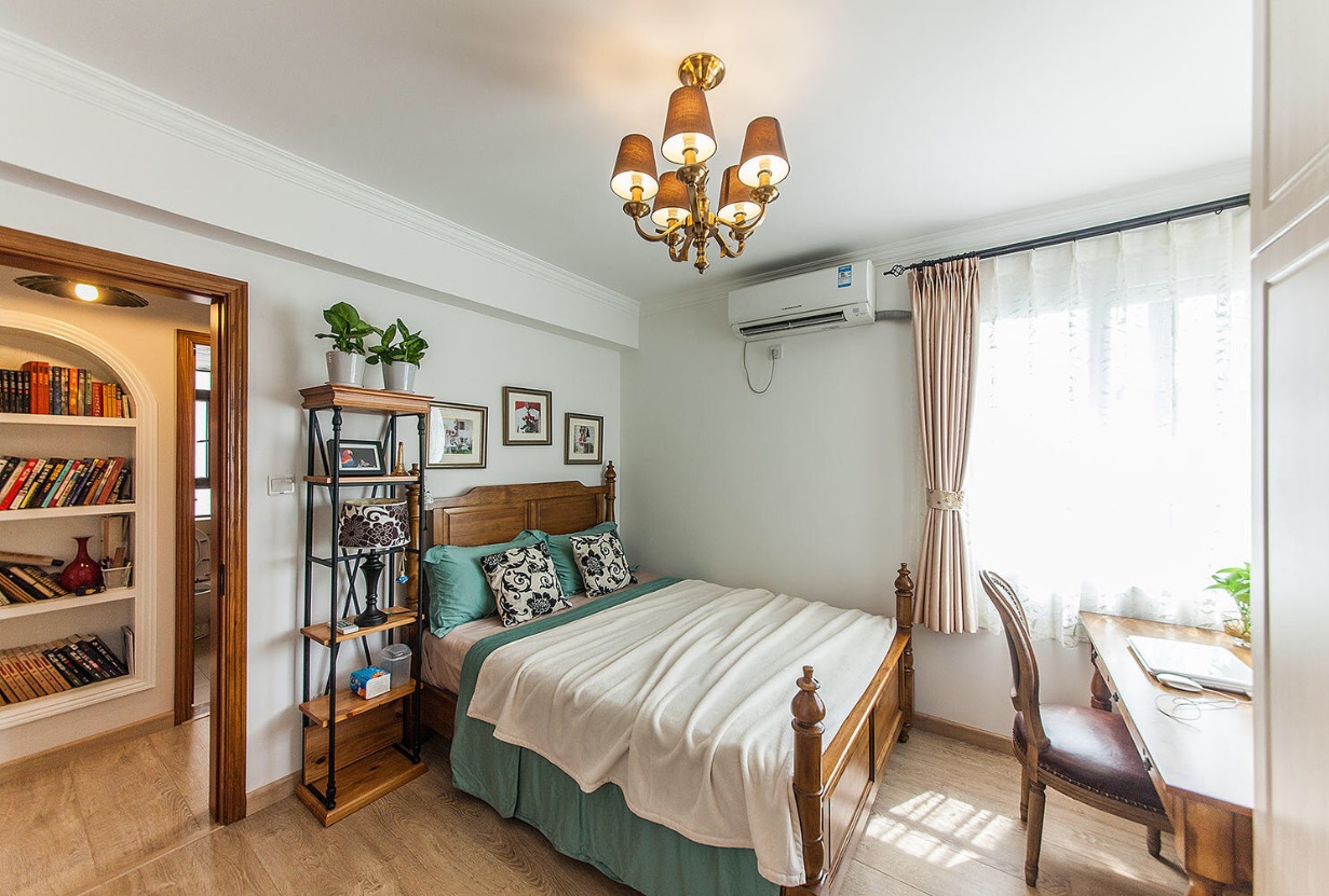 ?臥室;美式家具通常都帶有濃烈的大自然韻味,且在細節的雕琢上匠心獨具,很好地詮釋出田園的舒適和寧靜,大床正對著陽臺區域,設計師用極簡的手法架構的裝飾梁,既保證了兩個空間的溝通,也使電視得到了合理的安放,次臥一套極簡的煙灰綠床品,讓臥室如同雨后的晴空,有著春天一般的青春氣息。
