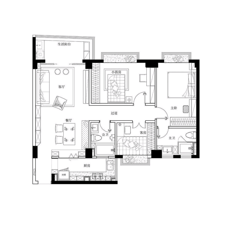 客廳以米白色為家居家具、墻面、吊頂的主色,以北歐元素相框、沙發、地毯作為簡約裝修的樣式點綴,不會使得簡約裝修太過于簡約,自然而優雅。