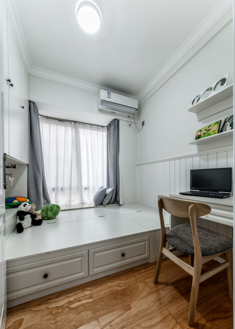 兒童房的面積分布也是蠻大的,有特色的是兒童房有一列桌臺,能放書本、能放電腦、能做課桌、能做梳妝臺,功能還是很全的。