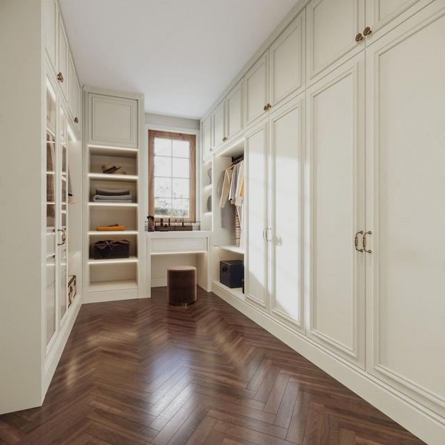 ??要考慮衛生間特殊性,改造衣帽間時要做好防水,保證衣帽間干燥,為了避免衣柜受潮發生變形、開裂等情況,衣帽間的柜子不要直接靠墻壁,底部要離地面有一定的距離。另外,可以安裝排風扇,確保空氣流通,避免在雨季時衣物出現發霉的情況。